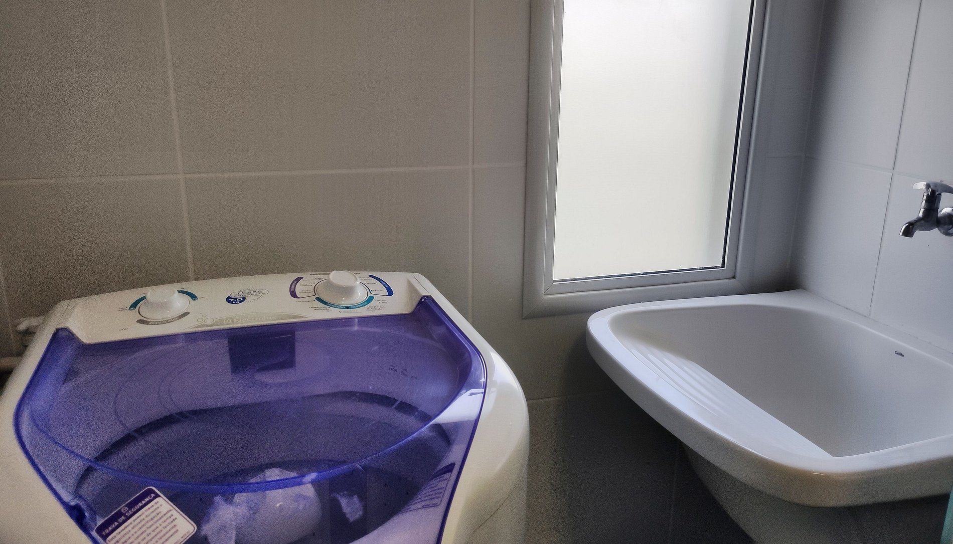 A lavanderia conta com uma máquina de lavar roupa, varal e ferro de passar.