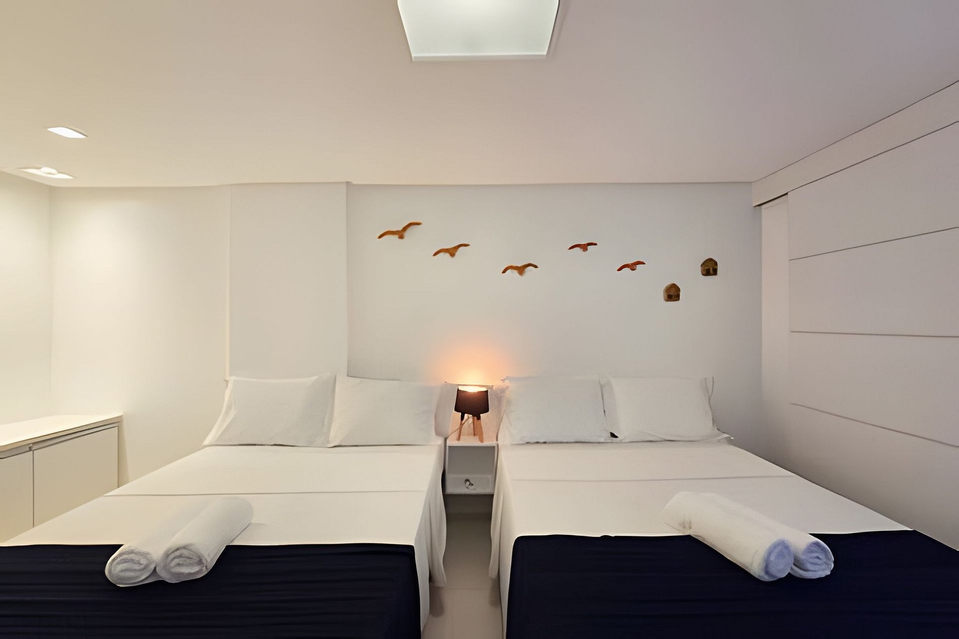 Quarto: 2 camas de casal bem confortáveis e ar-condicionado pra tu dormir no gelo.