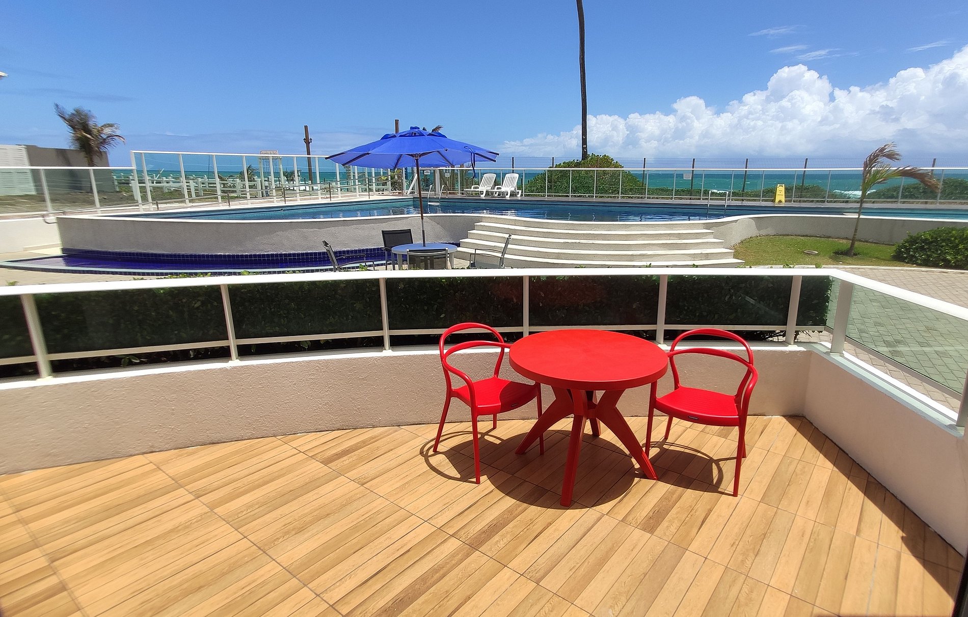Dispomos de uma linda piscina de frente ao mar, jardins e área de lazer para pratica de esportes. O condomínio conta com área de churrasqueira, portaria 24h e garagem.