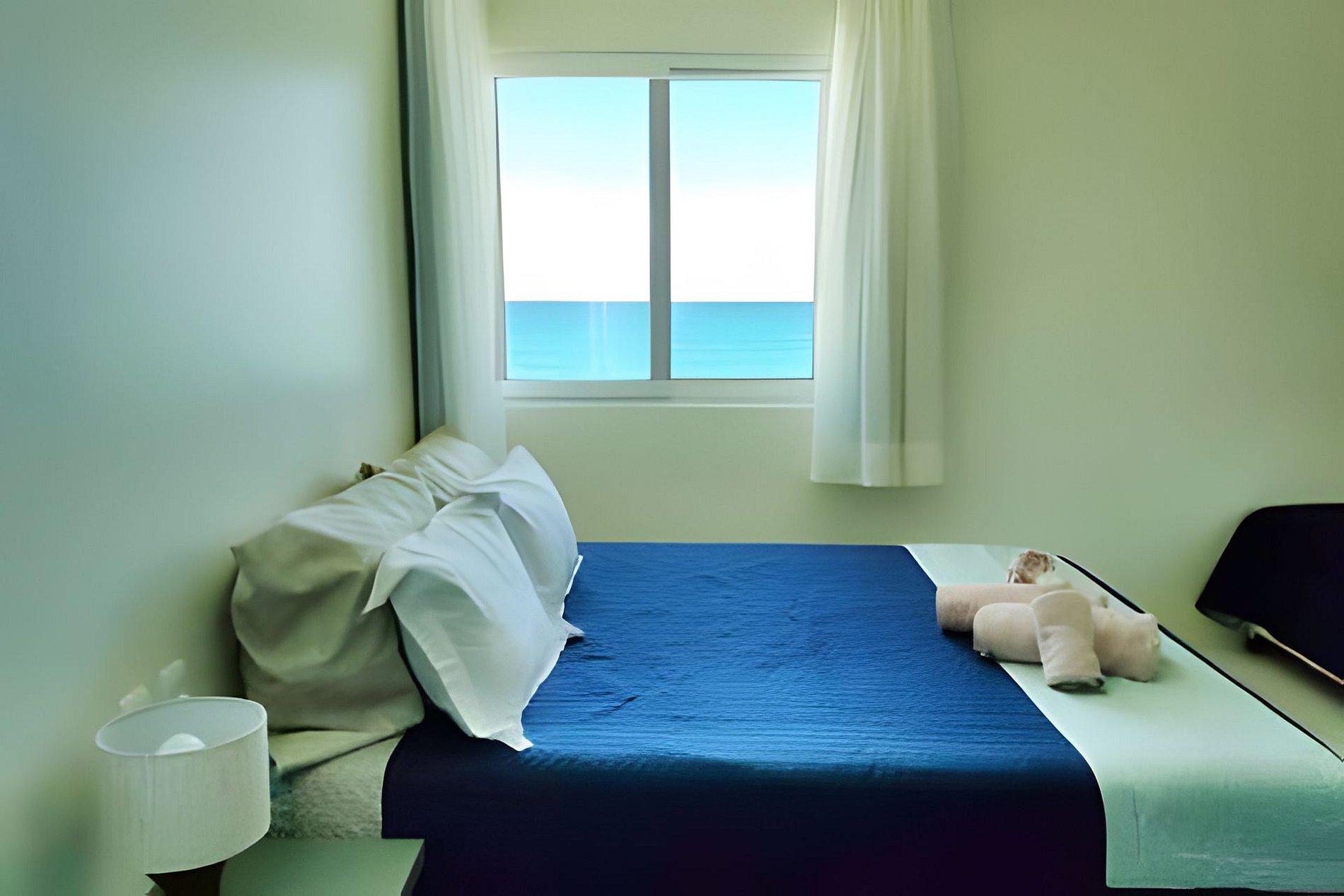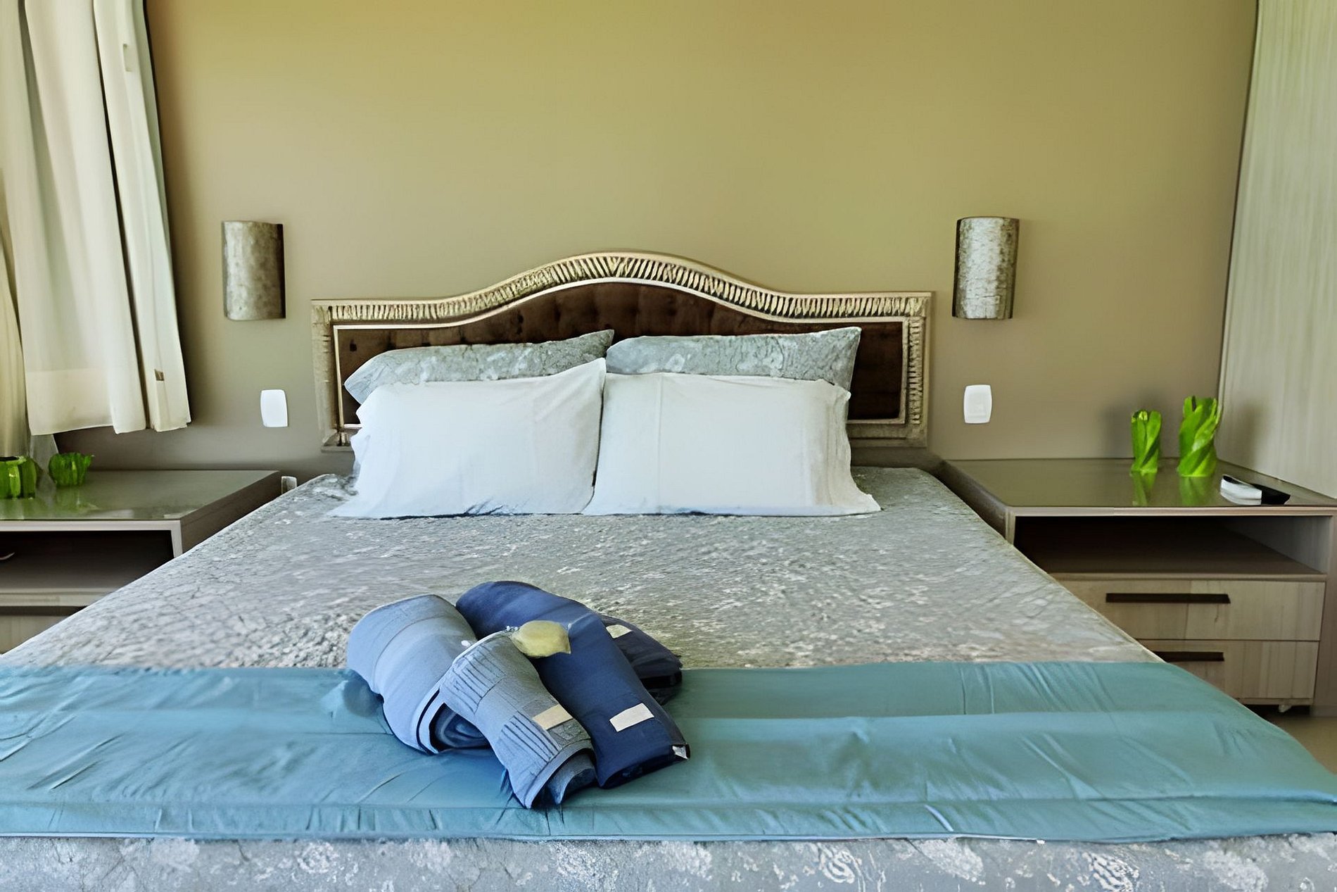 • Suítes Confortáveis: A Casa Golden View possui 4 suítes, sendo uma no térreo e três no pavimento superior. Todas as suítes são climatizadas e oferecem vistas do mar. A suíte Master é um verdadeiro destaque, com uma luxuosa cama King Size que garante o máximo de conforto.